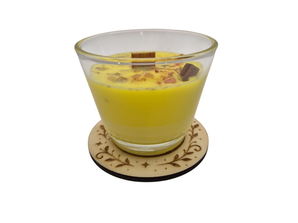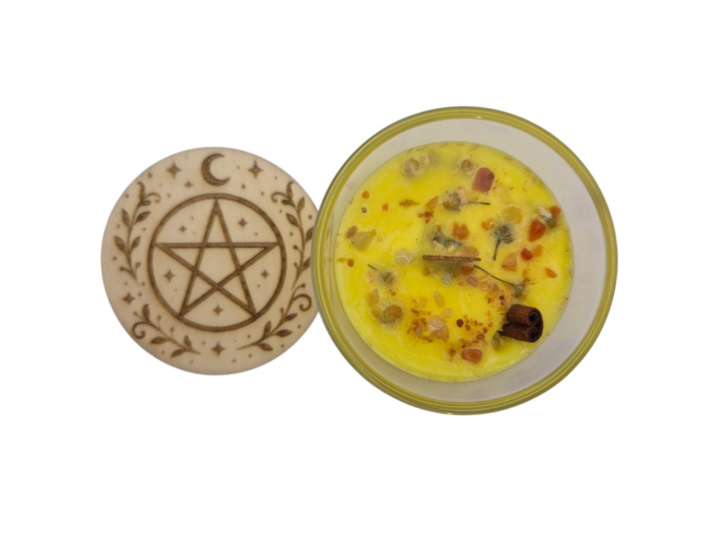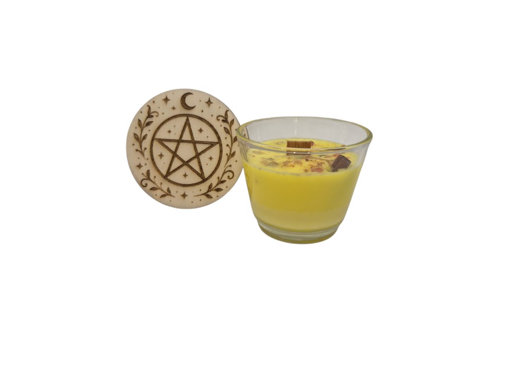 Součástí balení je také dřevěný podtácek s laserem vygravírovaným pentagramem, který působí jako ochranný a energetický základ při zapálení svíčky.