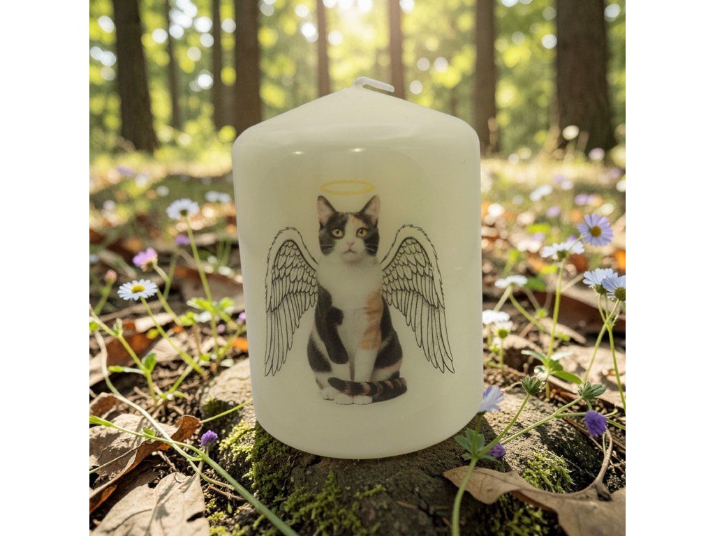 Tato vzpomínková svíčka nese jemný potisk trojbarevné kočky, který připomíná všechny krásné chvíle, které jste spolu prožili. Měkké, hřejivé světlo svíčky pomáhá šetrně uchovávat vzpomínky na vaši kočičku a přináší klid do duše v těžkých chvílích.