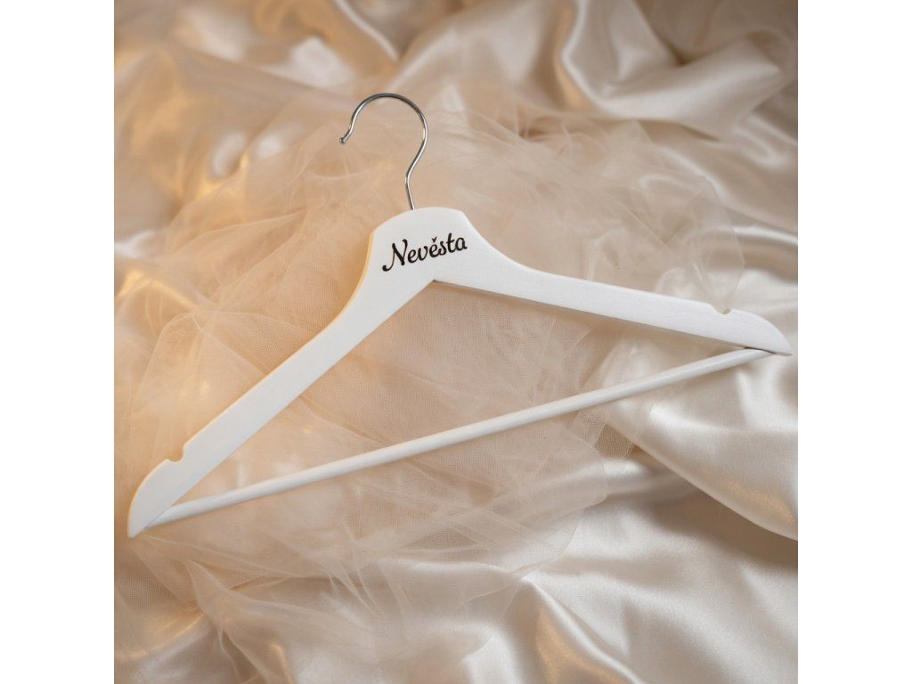 - Bílé dřevěné ramínko s černým nápisem „Nevěsta“