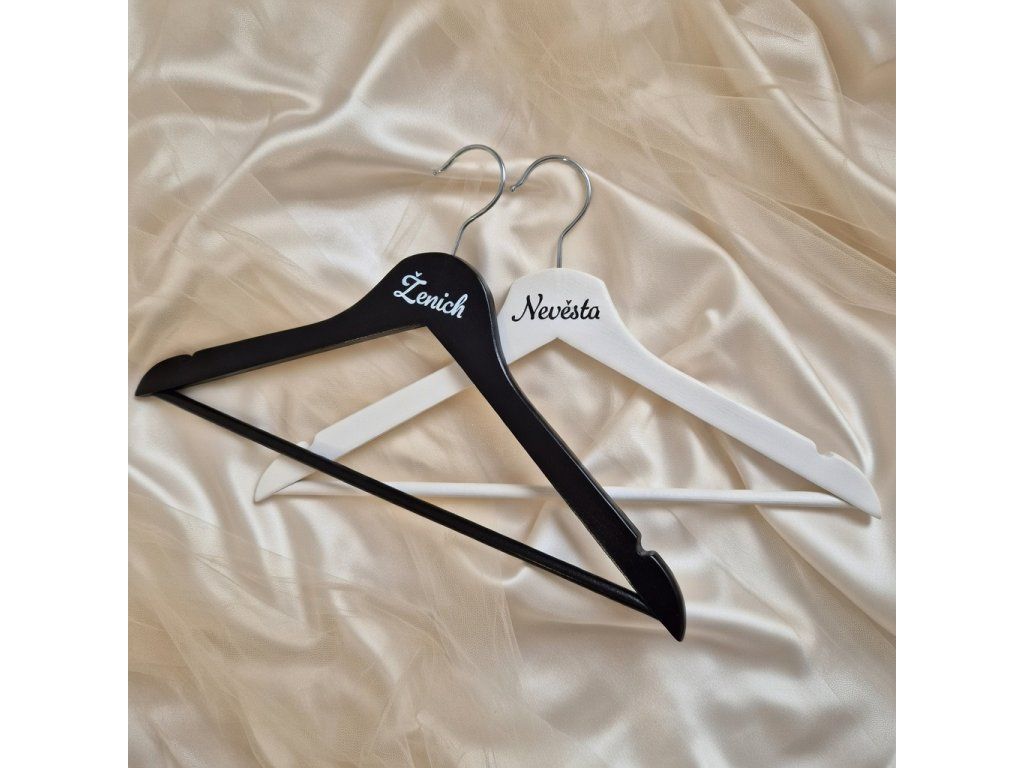 Obě ramínka jsou vyrobena z kvalitního dřeva, mají pevnou konstrukci a krásný kontrastní design. Ideální pro zavěšení svatebních šatů i pánského obleku.